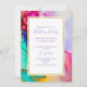 Invitation d'anniversaire avec un design artistique abstrait fantaisiste. Aquarelle peinture avec les couleurs mélangeant et mélangeant créant un motif fluide. Un cadre blanc avec une fausse bordure en feuille d'or superposée avec votre texte personnalisé écrit à l'intérieur.