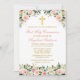 Elégante aquarelle rose blanc Floral First Holy Communion Invitation inclut roses roses, fleurs blanches et verdure. Croix d'or.