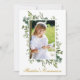 Aquarelle moderne Elégante Botanique Verdure Photo First Holy Communion Invitation inclut des feuilles d'eucalyptus et d'autres beaux feuillages. Croix d'or.
