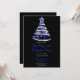 Un arbre de Noël bleu et argent sur un arrière - plan noir. Le dos de l'invitation est noir avec motif de neige