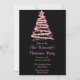 Un arbre de Noël rose et or sur un arrière - plan noir. Le dos de l'invitation est noir avec motif de neige