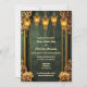 Un beau arrière - plan de brocart fleuri dans un vert de forêt profonde est encadré par un cadre doré orné qui a deux éléphants indiens d'or sur les coins inférieurs. Cinq lanternes brillantes pendent du bord supérieur et des lignes verticales délicates apparaissent sur les côtés. Cette conception inspirée de l'hindi a des modèles blancs sur elle pour votre libellé personnalisé et le dos a un modèle supplémentaire pour plus de détails aux invités et à la famille qui peut être supprimé si non requis. Les tons chauds confèrent à ce design une atmosphère luxueuse, élégante et haut de gamme. Cette invitation est idéale pour célébrer n'importe quelle cérémonie hindoue ou toute célébration ou mariage ethnique asiatique.