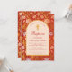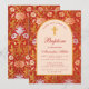 Une invitation de baptême florale qui combine des éléments vintage et modernes. Sur un motif floral de roses et de lys blancs sur fond rouge - un motif Morris vintage de John Henry Dearle (1860–1932), "Rose et Lily", de 1893, maintenant dans le domaine public - il y a une arche blanche avec du texte rouge à l'intérieur. Le mot Baptême et les noms sont écrits dans une écriture calligraphique élégante, la première ligne est un texte arqué, sur une croix jaune doré.