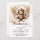 Design Whimsical pour les Baby showers invitations caractéristiques Bouquet luxueux de roseaux tropicaux pampas herbe en arc de bouho et paume de ventilateur séché feuilles élégamment enveloppe le mignon bébé ours portant sweatshirt neutre brun clair, comme si tendre maman câlin.