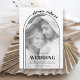 Arche moderne noir blanc et couverture photo minimaliste faire-part de mariage. Le point central est une arche élégante qui encadre élégamment une photo défraîchie du couple, ajoutant une touche de nostalgie à l'invitation. Les détails mariages sont placés avec goût sur l'arche, ce qui garantit qu'ils se fondent harmonieusement dans l'esthétique générale. Pour ajouter une touche unique, les noms du couple sont écrits dans une police incurvée en haut, suivant la courbe gracieuse d'une ligne qui s'étend à droite, créant une composition visuellement agréable. En retournant à l'arrière de l'invitation, une autre photo est révélée, apportant une touche personnelle et intime au design général.