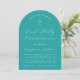 Une simple et moderne arche en forme de garçon première invitation de communion. Il n'a que du texte blanc sur l'arrière - plan turquoise. Dans la partie supérieure il y a une croix avec du texte voûté au-dessus. L'occasion et le nom sont écrits en script.