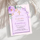 Un arrière - plan rose vif avec une arche. Décoré d'une fleur rose violette, violette, vert d'eau, d'eucalyptus et de papillons. Personnalisez et ajoutez un nom et des détails. Dos : couleur arrière - plan rose pâle.