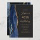 Le bord gauche de cette élégante invitation à la fête d'anniversaire moderne comporte une bordure en aquarelle bleu marine ornée d'une fausse parties scintillant dorée. Le texte personnalisable combine un script de couleur or et des polices sans serif sur un arrière - plan noir en ardoise. L'envers est assorti d'un design d'agate bleu et or.