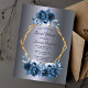 A l'avant : Un arrière - plan métallique à l'aspect foncé et faux argenté avec un cadre géométrique en faux or. Décoré de roses, de fleurs bleu marine et de tons bleus. Modèles pour le nom de la mariée et les détails du parti. Le nom est écrit avec un script de style écrit à la main, des lettres de couleur noire. Dos : Flamme foncé arrière - plan à l'aspect métallique. Une invitation dramatique et sombre ! Parfait pour un mariage d'hiver, douche nuptiale d'hiver.