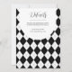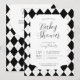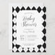 Invitation classique et intemporelle pour baby shower en noir et blanc à motif argyle. Styles de police et disposition personnalisables, avec un fond à motif simple et des formes de diamant géométriques épurées. Parfait pour les invitations de baby shower unisexes, les invitations de baby shower pour garçon, et les invitations de baby shower preppy.