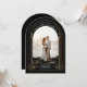 Save the Date in striking Art Deco style, featuring a gilded bronze geometric design on a rich black background. The arch-cut layout frames your photo with a glamorous vintage flair, adding a personal and dramatic touch. Elegant and bold, this design blends 1920s-inspired luxury with a clean modern layout. Perfect for couples who love timeless sophistication, this card makes a stunning first impression with its mix of classic charm and contemporary polish. Keywords: Art Deco, gilded bronze, black and gold, vintage glam, photo save the date, arch cut, elegant, modern.
