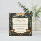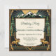 This bold birthday party design features a striking Art Deco mountain landscape framed by geometric borders in deep green, navy, and gold tones. Snow capped peaks rise beneath radiant sunburst lines, while tall evergreen trees create a symmetrical forest setting. Two stylized moose stand at the base, adding a distinctive wilderness touch to the composition. The central cream panel highlights elegant script lettering for Birthday Party, paired with clean modern typography for the event details. With its structured lines and rich color palette, this artwork blends vintage glamour with rugged outdoor charm for a sophisticated woodland celebration.