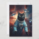 Une image captivante d'un chat noir habillé en astronaute, regardant avec confiance dans le cosmos. Entouré de soucoupes volantes et d'une nébuleuse vibrante, le chat incarne un sentiment d'aventure et de mystère.