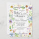 Une belle invitation au baby shower avec aquarelle blanc, rose, bleu, violet et vert fleurs et feuillage. Cette invitation comprend du texte gris et n'est pas sexiste.