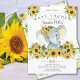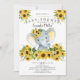 Design baby shower mignon avec un adorable éléphant entouré de bouquets de tournesol aquarelle posés sur un arrière - plan blanc. Retournez notre invitation pour voir un dos à floral coordonné pour une touche spéciale.