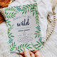 Les invitations adorables à la douche pour bébé pour votre sauvage sur le chemin comprennent une bordure de feuilles de jungle vert vif. "Né pour être sauvage" apparaît en lettres bleu marine, avec vos détails de baby shower en dessous.