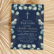 Invitation au baptême d'Eucalyptus. Fleur d'eucalyptus d'aquarelle aux feuilles dorés et arrière - plan bleu foncé. Invitation vos proches à assister et célébrer un baptême sacré avec notre invitation à la fleur d'eucalyptus magnifiquement conçue.
