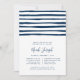 D'élégantes invitations au baptême ou au baptême côtier présentent une bordure supérieure de bandes dessinées à la main en bleu cobalt nautique. Personnalisez avec vos détails de baptême, de baptême ou de dédicace de bébé sous un mélange chic de caractères bloc, serif et manuscrits. Inclut l'espace pour la cérémonie religieuse et la fête ou la célébration à suivre. Les invitations se retournent vers un motif de minuscules ancres blanches sur bleu marine.