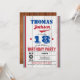 N'importe quel âge - vous pouvez modifier le numéro comme vous le souhaitez. Vous pouvez déplacer et redimensionner la queue de texte pour l'adapter à votre nom. Arrière - plan en bois rustique pour une invitation chic et classe pour adultes ou enfants. Le thème des couleurs rouge et bleu.