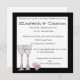L'invitation au buffet cocktail présente une illustration fantaisiste de Donna Gotlib représentant deux verres à vin et des fleurs roses dans un petit verre. Il y a une large bordure noire qui entoure l'invitation qui est d'un blanc éclatant. La police de caractères est un design d'impression calligraphique amusant et fantaisiste.