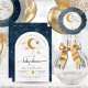 Célébrez dans un style cosmique avec cette magnifique invitation au baby shower ! 🌙 ✨ Doté d'un arrière - plan bleu foncé, d'étoiles dorées et blanches délicates, d'une lune dorée étincelante et d'un minuscule 🚀 de fusées, il donne le ton parfait à votre événement "Houston, We are Over the Moon, We Have a Boy!". Le design de l'arc ajoute de l'élégance, et il est entièrement personnalisable. 🌟 Un invitation rêvé pour votre petit !
