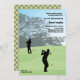 Pour le golfeur dévoué, une invitation à célébrer l'anniversaire qu'il aimera! L'invitation comprend un parcours de golf au premier plan vert et des arbres au loin ainsi que deux silhouettes de golfeurs. Le dos a des couleurs coordonnées dans un motif plaid.La carte est facile à customiser avec votre libellé, police, couleur de police et choix de six types de papier.