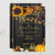 Récolte d'automne rustique, tournesol, fleurs botaniques d'automne et faire-part de mariage citrouille sur un bois de grange brun foncé comme arrière - plan.