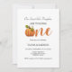 Une carte d'invitation à l'anniversaire élégante et tendance avec un citrouille orange brûlé aux feuilles d'automne. Selon le libellé, "nos petits citrouilles en font un."
