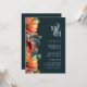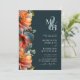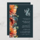 Elégant Monogramme QR Code RSVP Automne Floral Bois foncé Vert Automne Faire-part de mariage... L'avant de notre faire-part de mariage de monogramme floral à automne plein de vitalité présente les initiales de la mariée et du marié sur une esperie pastel et au-dessus d'un texte d'invitation personnalisé serif noir et sans serif typographie sur un arrière - plan vert de bois foncé. Conçu pour les mariages de la fin de l'été et de l'automne, notre faire-part de mariage "tout en un" à double face présente de belles fleurs peintes dans les tons turquoises foncés, bordeaux riche et orange coucher de soleil. Le verso de l'invitation inclut également votre code QR de site Web mariage ainsi que l'URL du site Web permettant à vos invités de facilement RSVP en ligne et de voir tous les détails normalement envoyés dans un paquet mariage. L'exemple de code QR et tous les exemples de texte (mis à part les éléments de calligraphie) peuvent être facilement révisés avec vos propres informations sur le modèle de personnalisation.