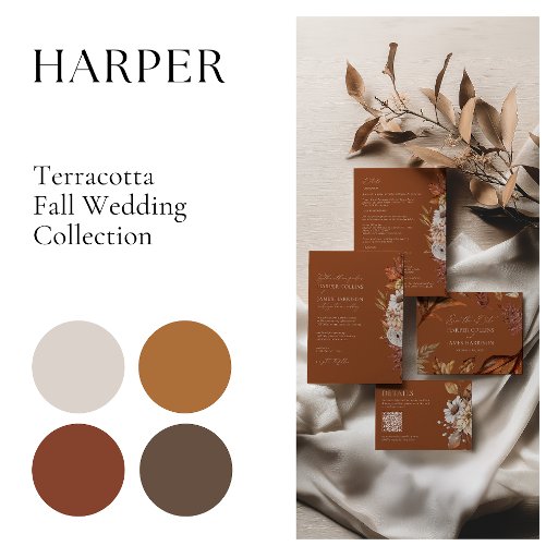 Cette invitation exquise capte l'essence de la beauté de l'automne avec son design floral délicat et ses tons chauds de terre cuite. Que vous planifiez une cérémonie rustique en plein air ou une réunion intime en intérieur, cette invitation donne le ton parfait pour votre événement. Personnalisez cette invitation avec vos noms, date du mariage et les détails du lieu pour en faire votre véritable invitation. Vos invités seront ravis de recevoir une invitation si bien conçue et réfléchie, préparant le terrain pour une célébration inoubliable de l'amour. Conçu pour coordonner avec la collection de Faire-part de mariage "Harper". Voir le lien de collection sur cette page pour voir tous les éléments correspondants dans cette belle conception.
