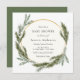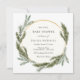 Élégante invitation au baby shower sur le thème de l'hiver présente un cadre doré entouré d'aquarelle à feuillage persistant et de pin. Personnalisez avec vos informations ou cliquez sur "Cliquez pour customiser plus loin" pour modifier les styles, la taille et les couleurs des polices.