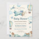 Invitation baby shower unique et imaginative à accueillir un bébé, cette conception présente un livre d'histoire illustrant un ours volant à bord d'un avion avec des montgolfières, des nuages bouffants et d'autres avions volant pour célébrer l'événement spécial. Les éléments design sont illustrés dans des aquarelles douces de bleu, beige et marron pour véhiculer un thème magique du livre d'histoires. Personnalisez avec vos détails de baby shower.