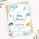 Baby shower invitation avec sous le thème de la mer pour la partie nautique babu douche party. Cette invitation a des illustrations aquarelles peintes à la main comme des baleines, des dauphins, une licorne, une pieuvre mignonne, un petit poisson orange, un hippocampe et des éléments nautiques comme ancre. Idéal pour une fête de baby shower en plein air.