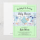 Une invitation fantaisiste au baby shower avec un babylot illustré sur une ligne de vêtements avec des vêtements de bébé, des fleurs et un groupe de fleurs sauvages sur un arrière - plan joyeux vert menthe. Personnalisez votre douche. Un style neutre pour le genre.
