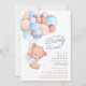L'adorable design de bébé garçon avec le plus doux bébé garçon ours avec un tas de ballons dans les tons bleu et marron. Visitez notre boutique pour voir cet invitation pour un baby shower neutre ou pour garçons.
