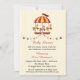 Une invitation baby shower neutre pour les femmes avec carrousel et des drapeaux festifs de bottes d'étoiles sur arrière - plan jaune pâle avec des rayures subtiles.
