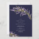 Une élégante invitation à baby shower d'aquarelle de lavande florale classique chic avec des branches et des fleurs de tiges botaniques de lavande violette, feuillage vert et marron et calligraphie élégante sur bleu marine foncé.