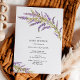 Une élégante invitation à baby shower d'aquarelle de lavande florale classique chic avec des branches et des fleurs de tiges botaniques de lavande violette, feuillage vert et marron et calligraphie élégante.
