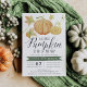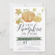 Tombez amoureux de ces invitations rustiques élégantes de douches pour bébé d'automne. Le design présente des citrouilles orange aquarelle ornés de feuilles d'automne. "Un peu de citrouille est en route" apparaît dans le script de calligraphie chic lettering. Personnalisez avec votre baby shower et les détails du registre sous la riche lettres bleu marine.