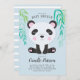 Belle invitation pour votre soirée baby shower à thème panda ! Il y a une jolie illustration d'un panda bébé avec des feuilles en bambou des deux côtés. Sous l'ours du panda se trouve l'information de la fête baby shower. Le dos de la carte est à rayures bleues et blanches. Le texte est facilement personnalisable en ligne.