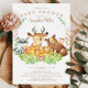 Adorable invitation de baby shower avec un cerf, un ours, un hibou, un renard et un raton laveur encadrés d'une délicate vigne à feuilles de fleurs roses posée sur un arrière - plan rustique en bois pour un baby shower neutre pour les hommes. Retournez notre invitation pour voir un retour de coordination pour une touche spéciale supplémentaire.