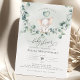 Un petit éléphant mignon sur une branche d'eucalyptus se balançant. Cette invitation baby shower présente des aquarelles dessinées à la main et des polices modernes.