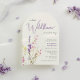 Une invitation à la douche pour petite fille en forme d'arc clair et fantaisiste avec "un petit fleur sauvage est en route" écrite dans un mélange de typographie gris-doux moderne et un script violet élégant, et un bouquet d'aquarelle d'inspiration boho de fleurs sauvages mauve, rose et jaune.