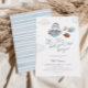 Célébrez la future maman avec cette invitation de baby shower à thème voyage bleu et bronze avec une aquarelle illustrant un hippo mignon dans un avion avec ballons, nuages et étoiles et un côté inverse rayé bleu.