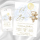 Oh garçon baby shower invitation avec mignon bébé garçon ours et ballon sur un bébé bleu et or arrière - plan. Cette invitation à baby shower en ballons de garçon est facilement personnalisée avec vos détails de l'événement.