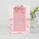 Une invitation au baby shower rose et blanc avec un arc festif, des pois et des rayures zébrées tandis que le texte est encadré d'une bordure de parties scintillant imitation.