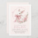 Bienvenue à une fille lapin coquette avec cette invitation charmant et élégante au baby shower. Doté d'un lapin d'aquarelle douce à l'arc rose et de fines fleurs roses, ce design est parfait pour une fête de printemps ou de Pâques. Avec une coquette et une touche moderne, cette invitation donne le ton d'un baby shower charmant et élégant.