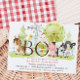 Invitation de baby shower de garçon sur le thème de la ferme avec animaux de ferme. Le dos de l'invitation a un motif en vichy rouge.