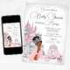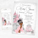 Baby shower de princesse Afro rose et argent avec adorable petite princesse avec cheveux afro mignon avec jolie couronne et cape en diamant sur un joli arrière - plan parties scintillant rose et argent. Cette invitation de baby shower princesse rose et argent est facilement personnalisée avec vos détails de l'événement.