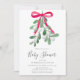 Famille Invitation et amis à votre Baby shower de Noël avec cette invitation festive. Il est décoré avec du faux-pied vert aquarelle, un ruban rouge et une typographie stylisée. Facile à personnaliser. Aquarelle originale © Michele Davies.